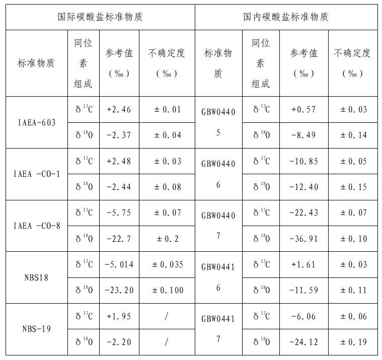 碳酸鹽碳氧同位素標(biāo)準(zhǔn)物質(zhì)是用于校準(zhǔn)實驗中測量結(jié)果的基準(zhǔn),具有已知的碳同位素(δ¹³C)和氧同位素(δ¹?O)比值。PDB(Pee Dee Belemnite)和VPDB(Vienna Pee Dee Belemnite)是兩種不同的碳同位素國際標(biāo)準(zhǔn),它們在地球科學(xué)和生物化學(xué)研究中用于測量和比較碳氧同位素比值。PDB標(biāo)準(zhǔn)最初是基于美國南卡羅來納州Pee Dee地層中的一種特定貝類化石(Belemnite)的碳氧同位素比值來定義的。隨著時間的推移,原始的PDB樣品幾乎被耗盡,因此國際科學(xué)界采用了一個名為VPDB的新的參考標(biāo)準(zhǔn)。VPDB是一個理論上的標(biāo)準(zhǔn),它基于原始PDB樣品的同位素比值,但通過高精度的測量和校準(zhǔn)來定義,現(xiàn)已被用作大多數(shù)現(xiàn)代碳氧同位素分析的參考標(biāo)準(zhǔn),包括由國際原子能機構(gòu)(IAEA)提供的IAEA-CO-08和IAEA-603,由美國國家標(biāo)準(zhǔn)與技術(shù)研究院(NIST)提供的NBS18和NBS19,中國國家標(biāo)準(zhǔn)物質(zhì)GBW04405、GBW04406、GBW04407等(表1)。